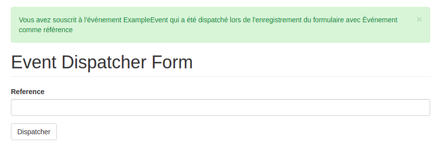 $dispatcher->dispatch(ExampleEvent::SUBMIT, $event);Le code snippet si-dessus montre comment dispatcher un événement n'importe où dans notre site.